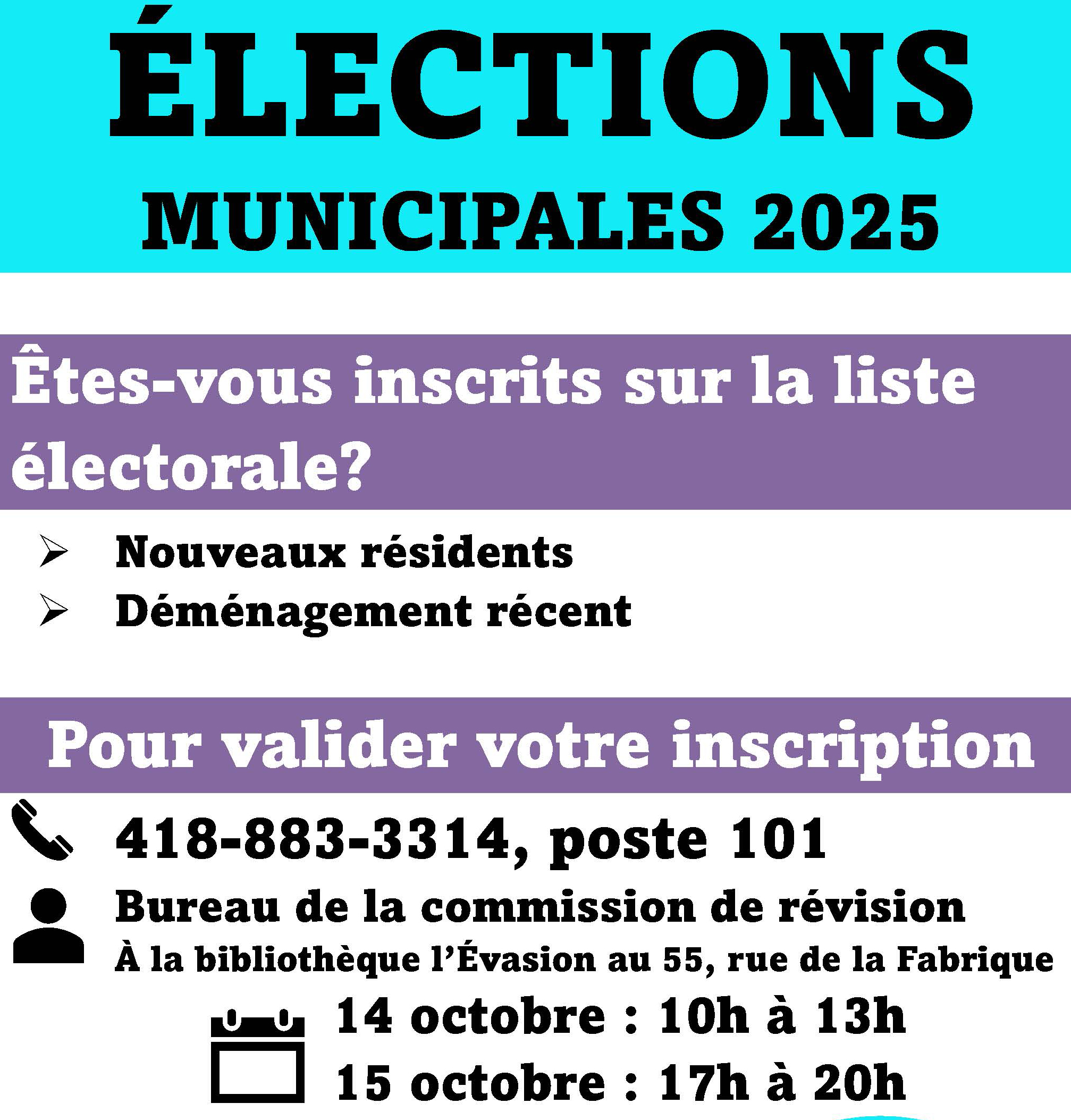 Vous possédez une propriété à Sainte-Claire sans y être domicilié ou une entreprise domiciliée à Sainte-Claire? Vous pouvez demander d’être inscrit sur la liste électorale par une demande d’inscription ou une demande de procuration. Nous faire parvenir d’ici le 15 octobre 2025 (étant le dernier jour fixé par la municipalité pour présenter une demande de modification devant la commission de révision de la liste électorale).